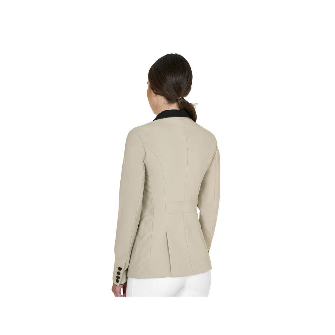 Giacca da concorso da donna realizzata inย tessuto tecnico traspiranteย e ultra leggero di alta qualitร , studiata per garantire performance elevate in gara. Il modello presenta chiusura a tre bottoni, tasche laterali e logo Equestro in rilievo sulla spalla, elemento iconico del brand.