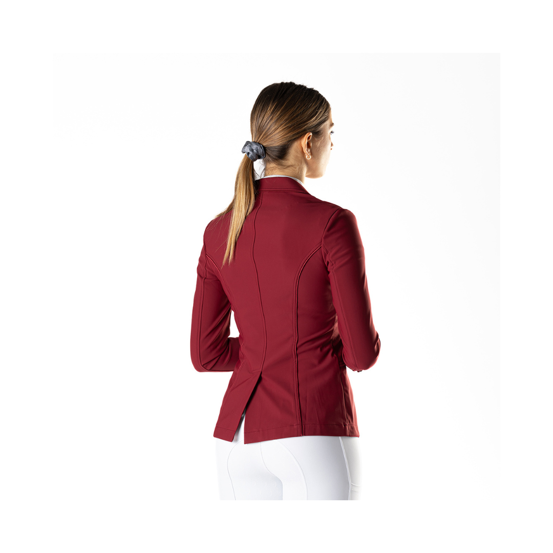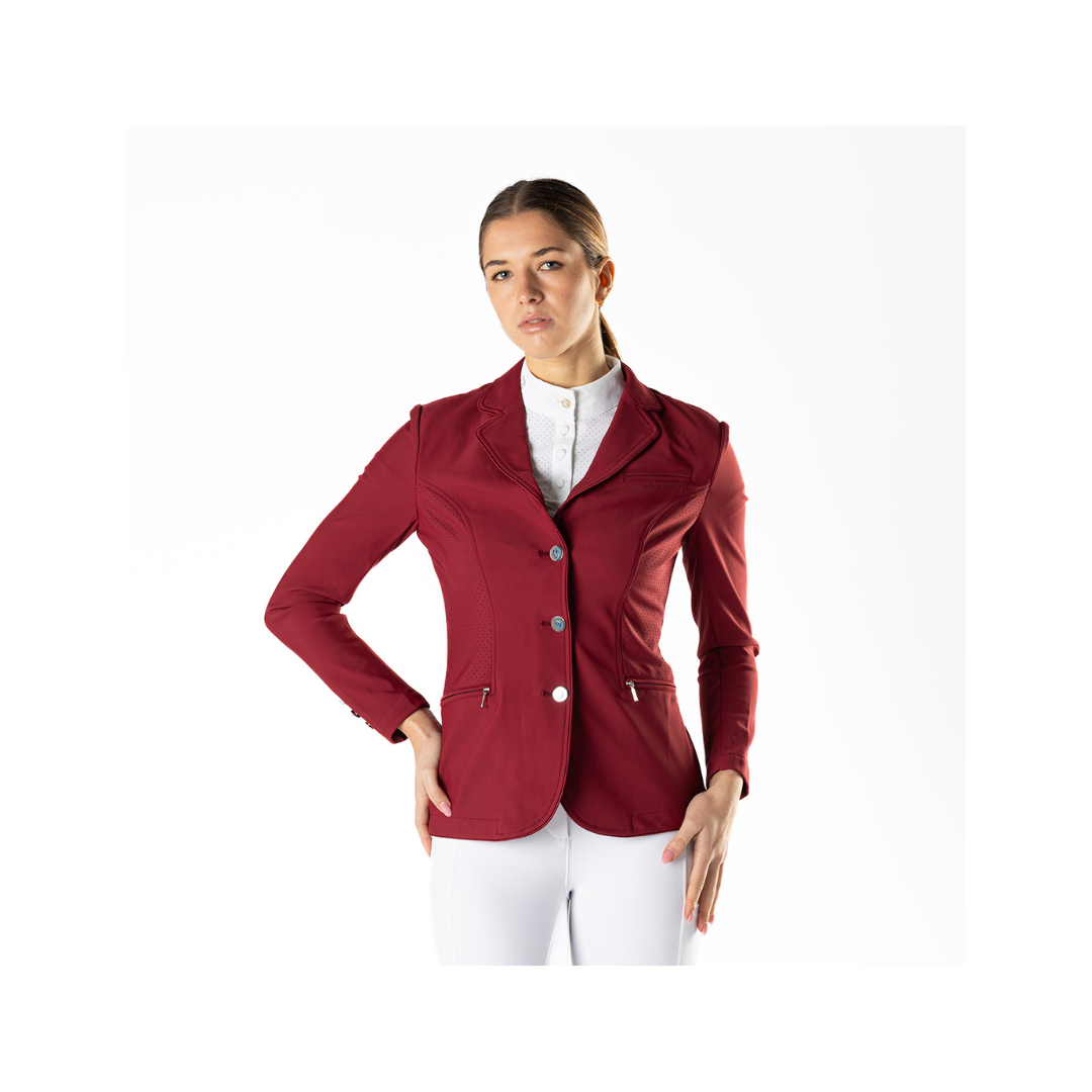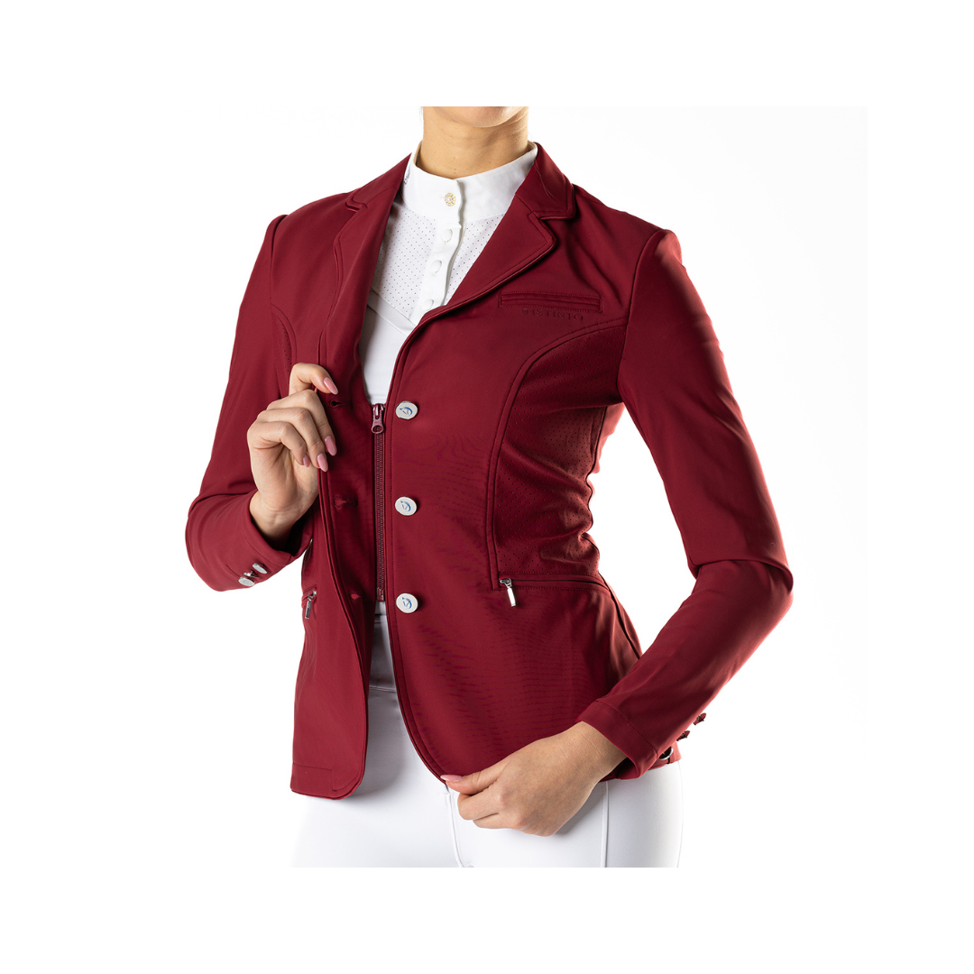 La giacca รจ sciancrata con cerniera di sicurezza, dotata di profili in satin e bottoni con marchio a specchio. Il tessuto รจ completamente elasticizzato con traforature.