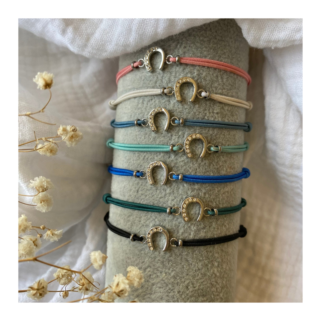 Unisce delicatezza e simbolismo: il suo piccolo set di ferri di cavallo con strass è montato su un cordino colorato regolabile, per valorizzare il polso con leggerezza ed eleganza.