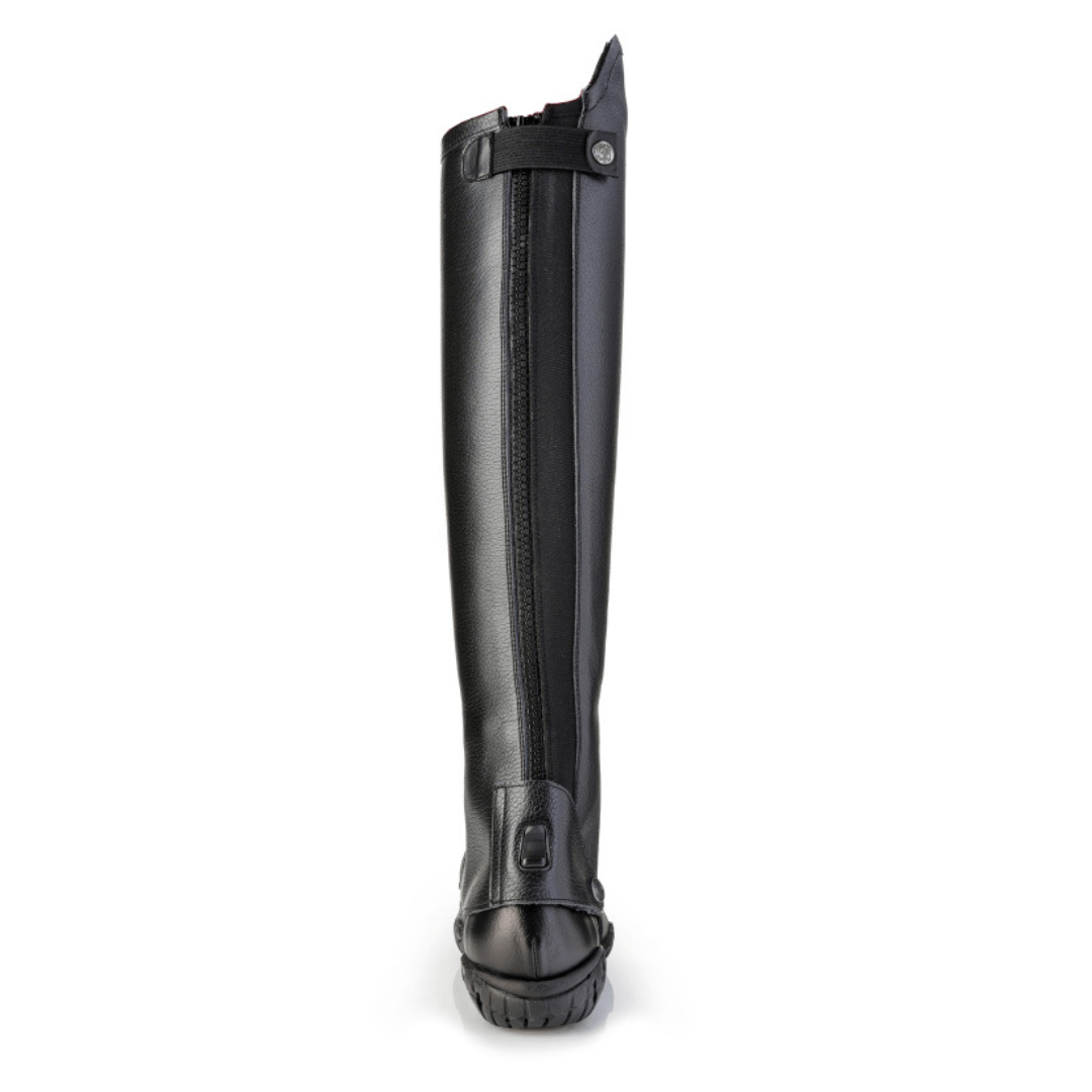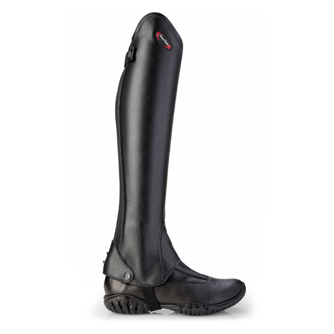 Ghetta in pelle Nappa robusta, elastico e cerniera posteriore, poggia sperone regolabile, taglio esterno alto.