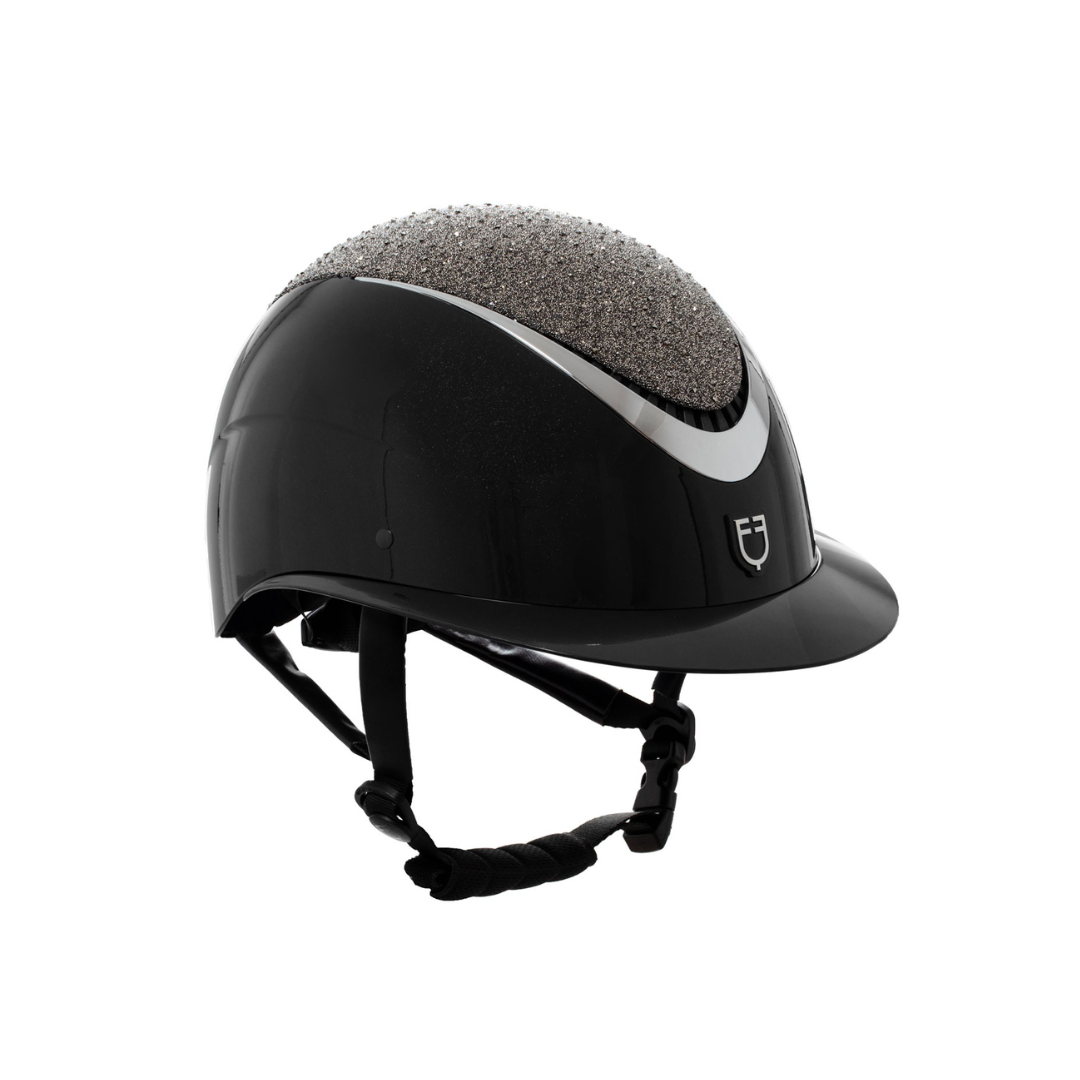 La calotta esterna è lucida e impreziosita dall’applicazione di brillantini tono su tono sull’aereatore e targhetta con logo Equestro.