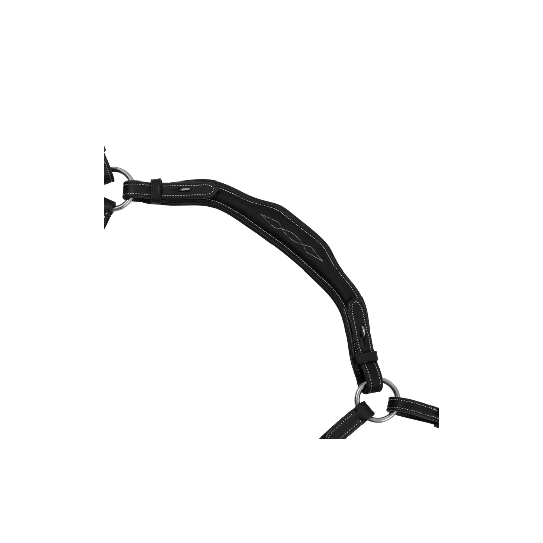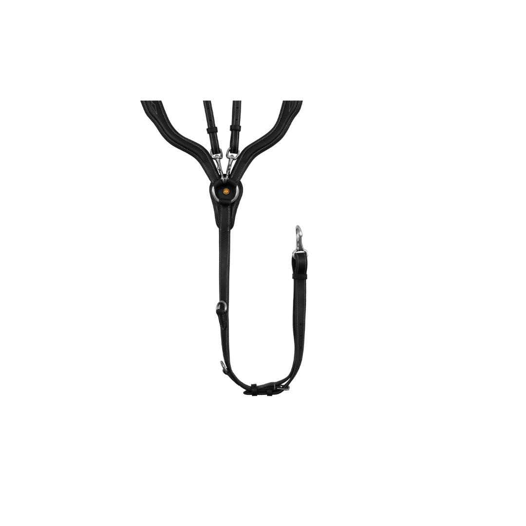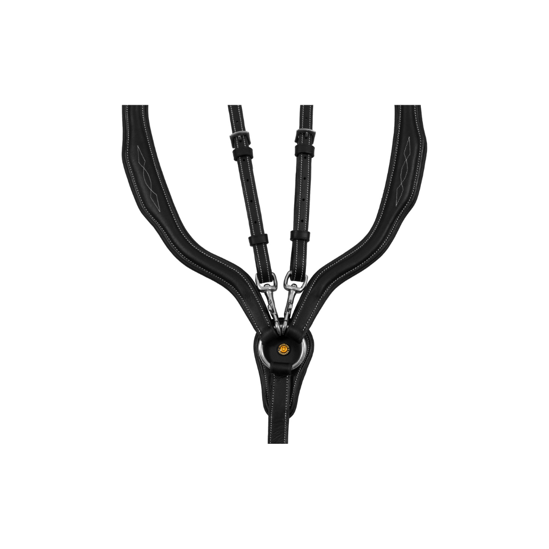 Il pettorale inย cuoio di alta qualitร ย impedisce alla sella di indietreggiare per mezzo diย ganci in acciaio inoxย che vanno a legarsi direttamente alle cambre della sella.