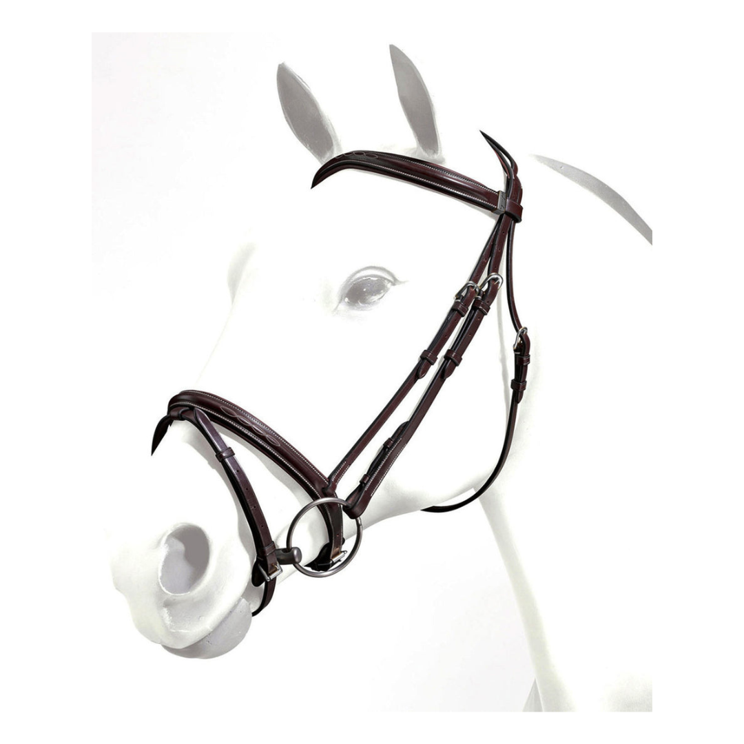 Testiera da salto in cuoio naturale, dotata di frontalino bombato e capezzina irlandese con ricamo.