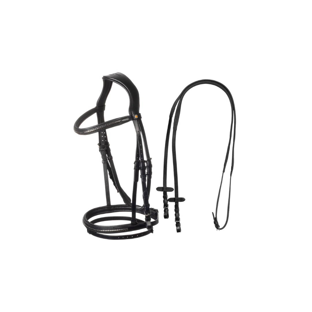 Realizzata in pelle di alta qualità, la briglia è dotata di fibbie robuste in acciaio inox e include redini con grip antiscivolo. Un accessorio perfetto per dressage, salto ostacoli o passeggiate, pensato per cavalieri che cercano qualità e stile.